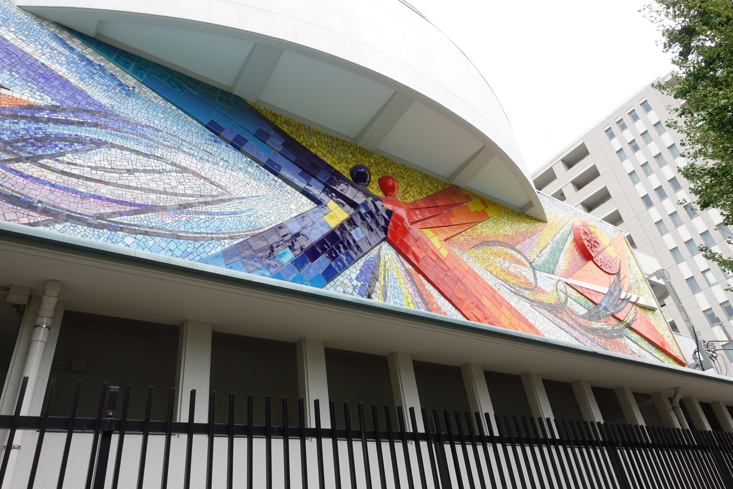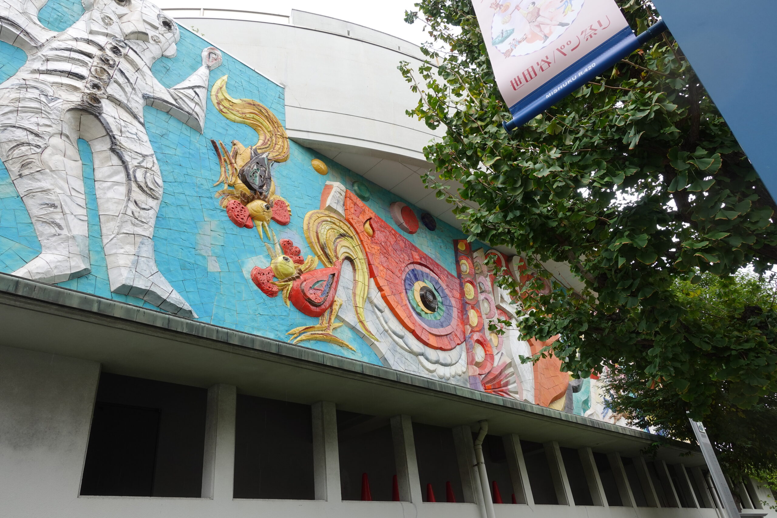 世田谷区立池尻小学校の外壁に描かれた作品は、強い存在感を放っています。