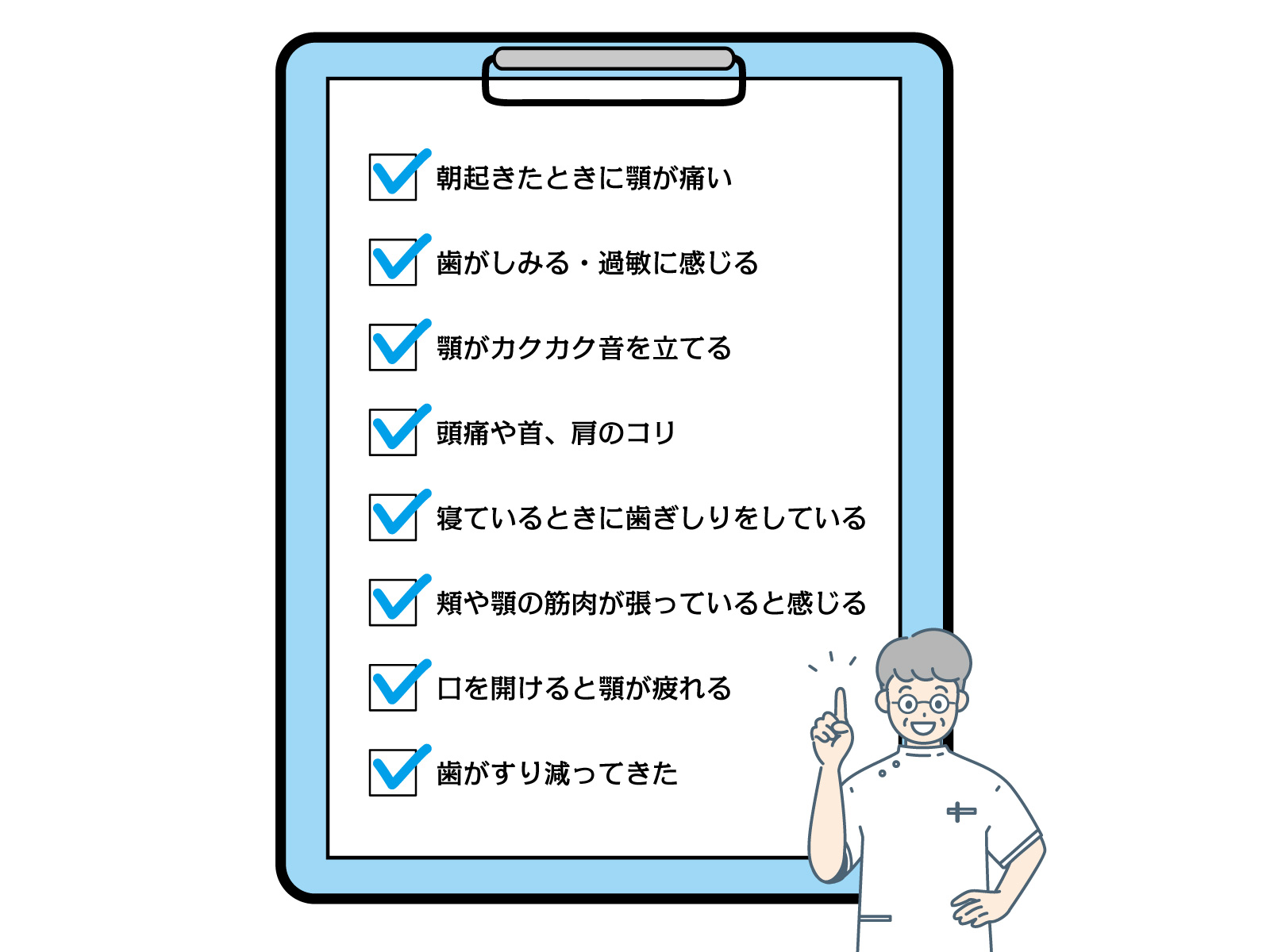 チェック項目に該当することがあれば、早めに歯科を受診することをおすすめします。適切な対処をすることで、症状の悪化を防ぐことができます。